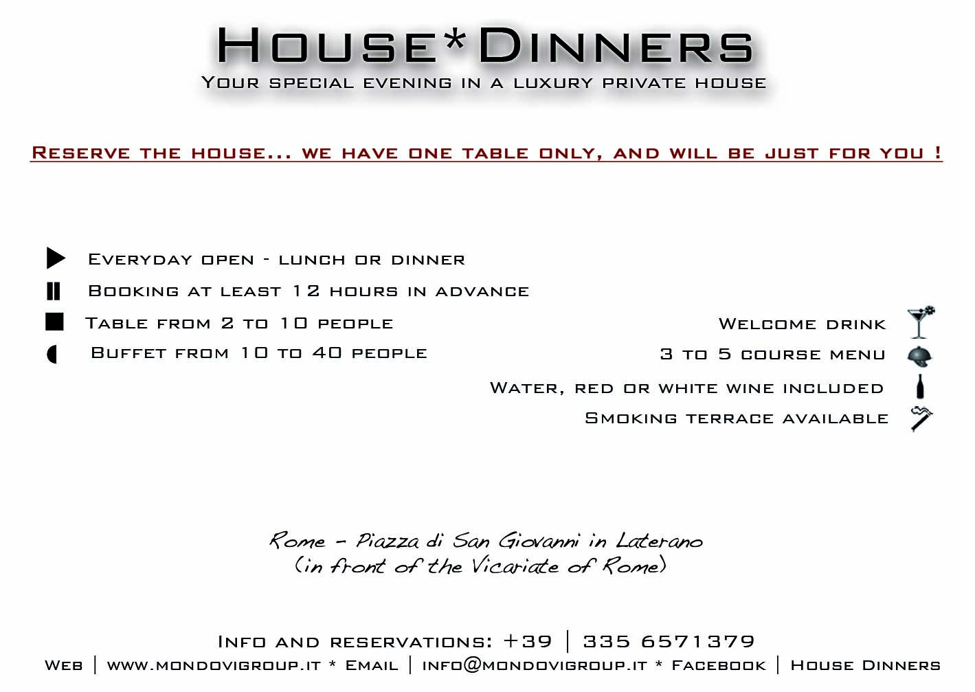House*Dinners is the new exciting way to spend your evening in Rome. The fantastic view of the historical Rome from a noble apartment combined with the hi-quality italian traditional cuisine, are just some of the aspects of an unique event. The landlord will welcome you, entertain you and cook for you spoiling your taste buds with the amazing experience of “Food Mama | Catering”. (see the menu).